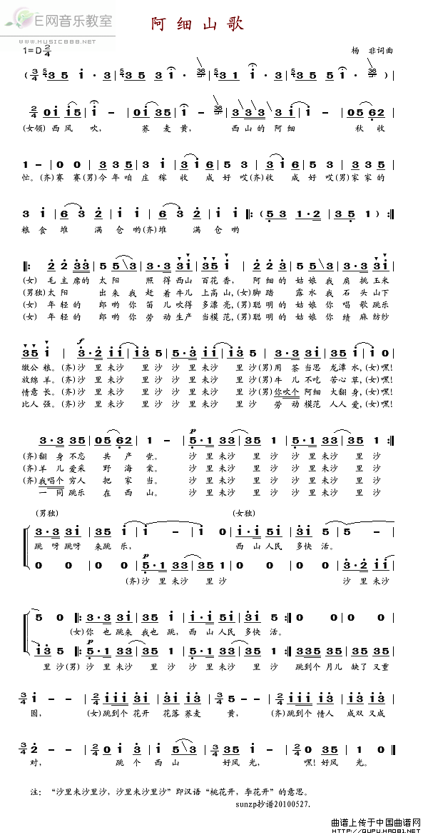 >> 阿细山歌-国防文工团合唱队(简谱)
