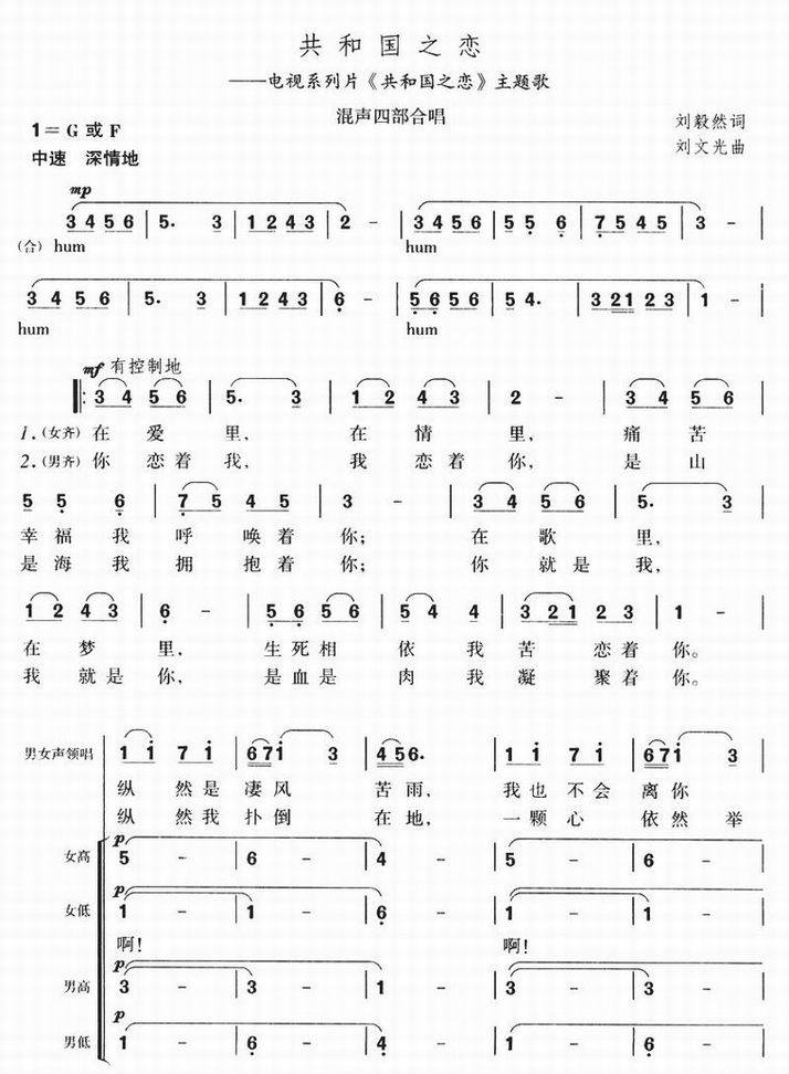 >> 共和国之恋-混声四部合唱(《共和国之恋》主题歌合唱简谱)