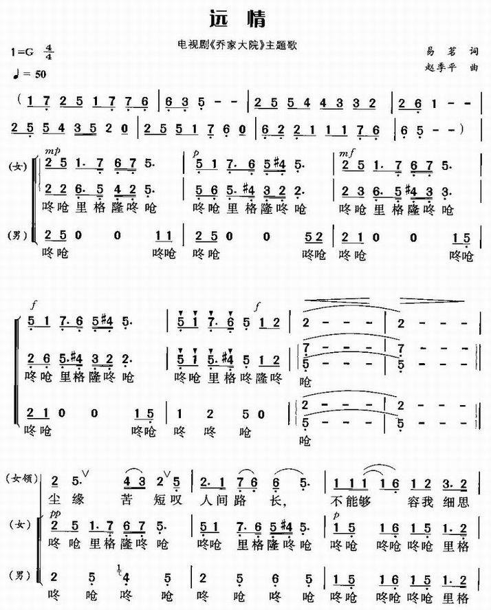 >> 远情-《乔家大院》主题歌(领唱与合唱简谱)