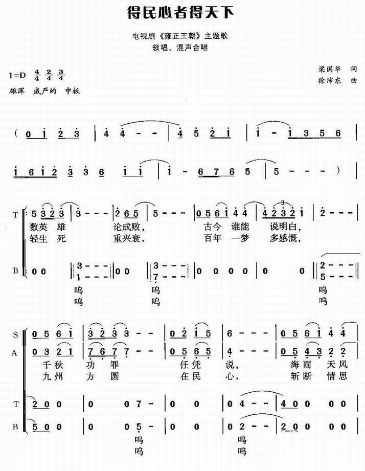得民心者得天下-《雍正王朝》主题歌(领唱与合唱简谱)
