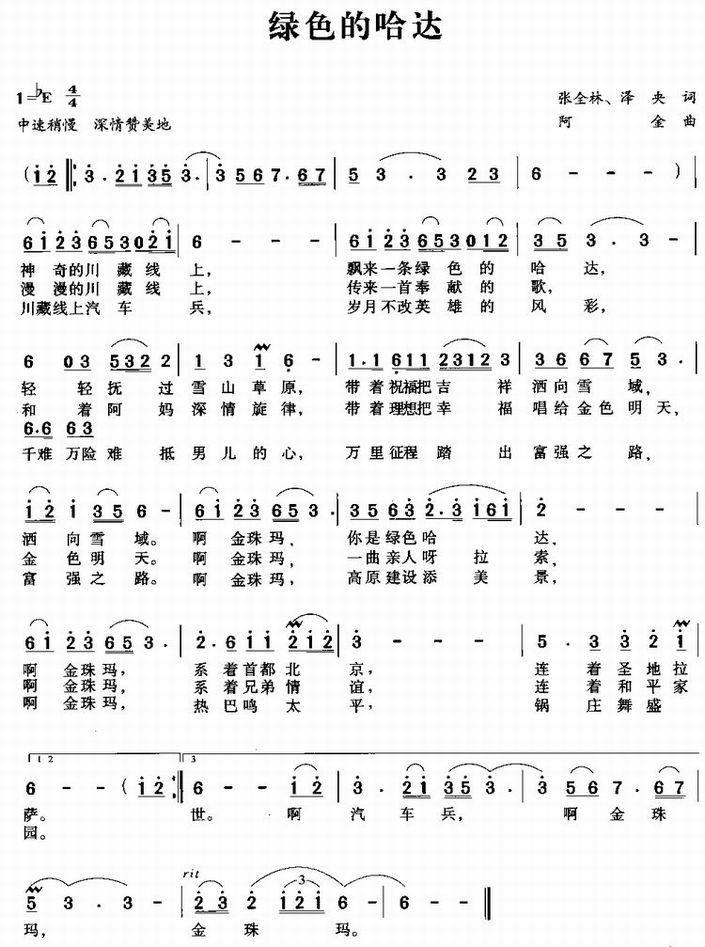 >> 绿色的哈达-张全林 泽央词 阿金曲(简谱)