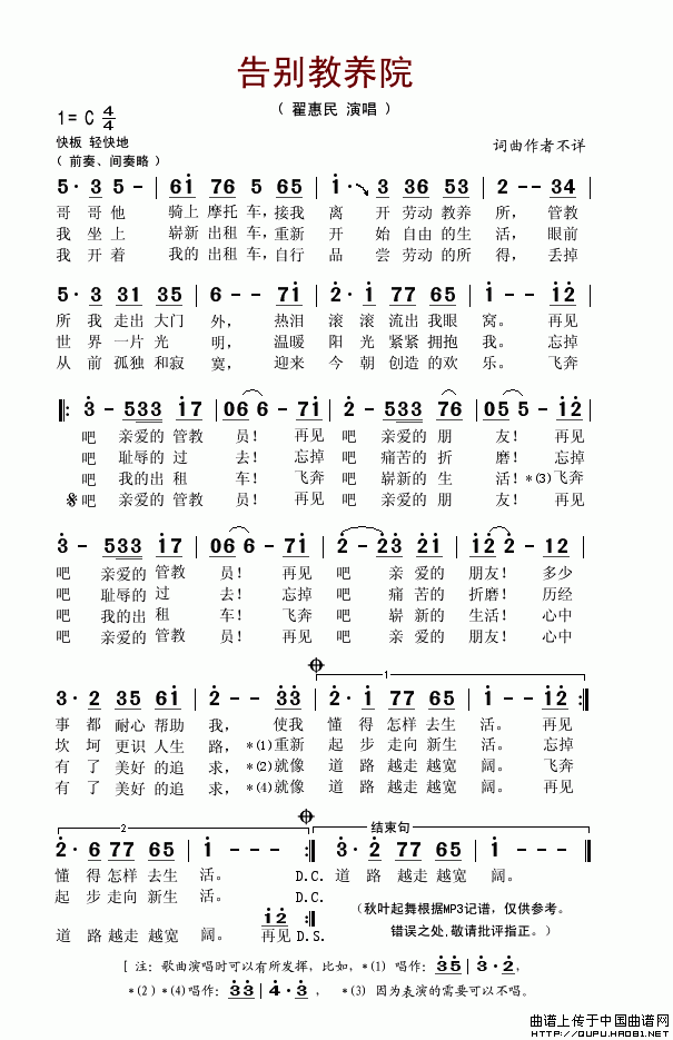 >> 告别教养所-翟惠民(简谱)