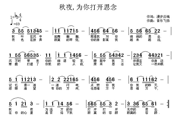 | 落叶在风中起舞翩翩 那是我对你绵绵的思念 风不时带来你的细语轻言 朦胧中我又依偎在你身边 记忆像一道闪电点燃你我的昨天 秋夜为远方的你打开无尽的思念 夜色在拨弄寂寞的琴弦 你的身影离我越来越远 寒露打湿了你我的从前 原来思念让我又一夜未眠 泪眼遥望有你的方向任思绪万千 在你的心里是否烙下我寂寞的容颜? |