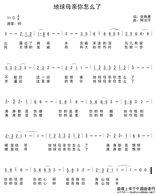 >> 地球母亲你怎么了-张艳惠词 阿汝汗曲(简谱)