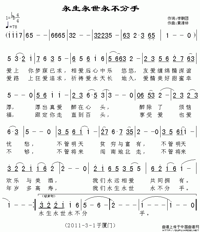 >> 永生永世永不分手-李朝团词 黄清林曲(简谱)
