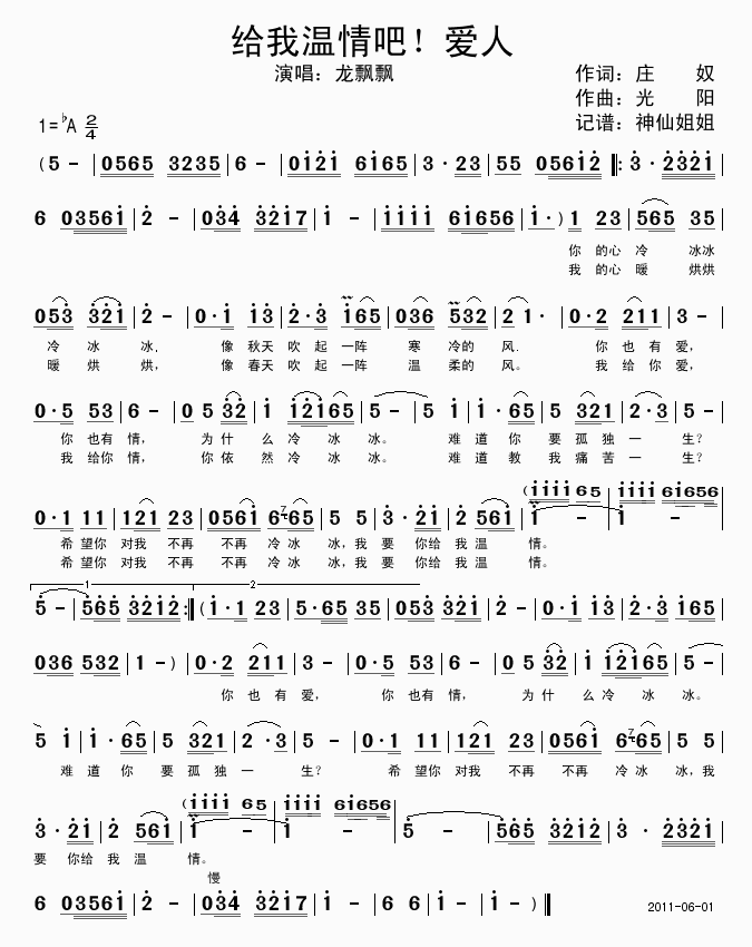 >> 给我温情吧!爱人-龙飘飘(简谱)