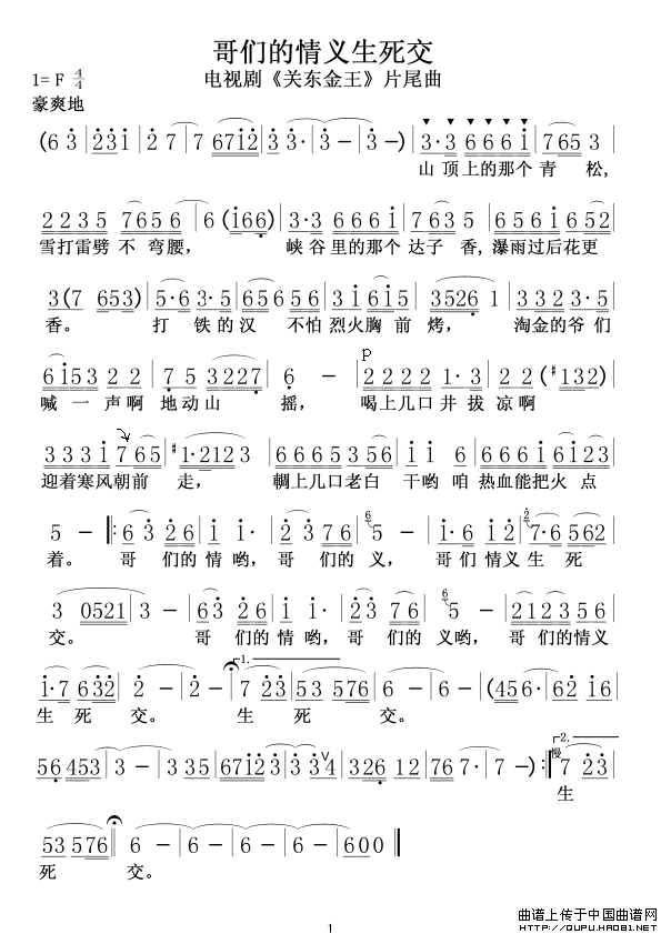 >> 哥们的情义生死交-电视剧《关东金王》片尾曲(简谱)