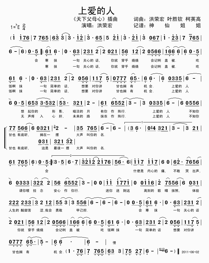 >> 上爱的人-洪荣宏(《天下父母心》插曲简谱)