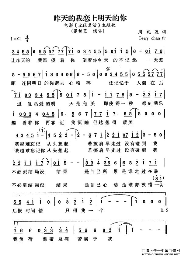 >> 昨天的我恋上明天的你-张柏芝(《无限复活》主题歌简谱)
