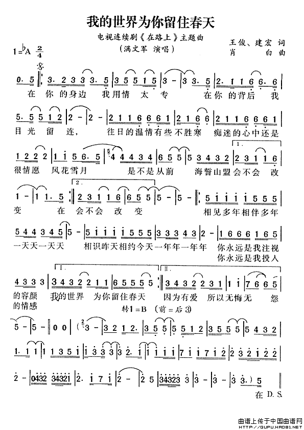 >> 我的世界为你留住春天-满文军(《在路上》主题曲简谱)