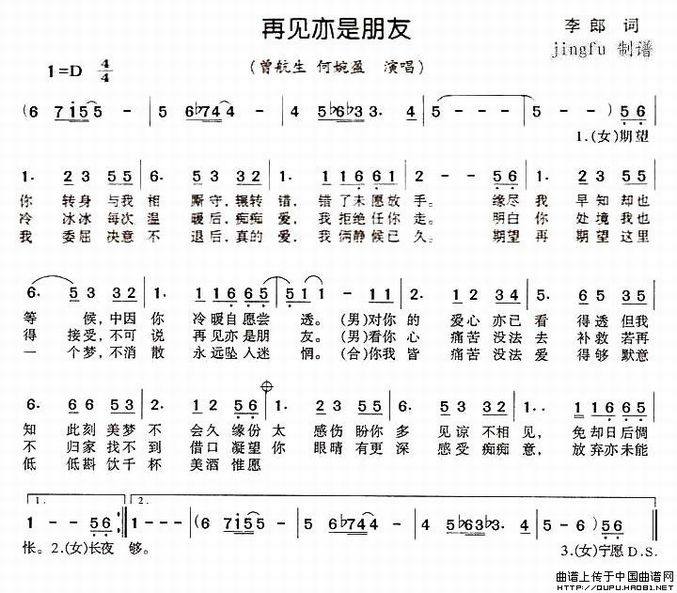 >> 再见亦是朋友-曾航生 何婉盈(简谱)