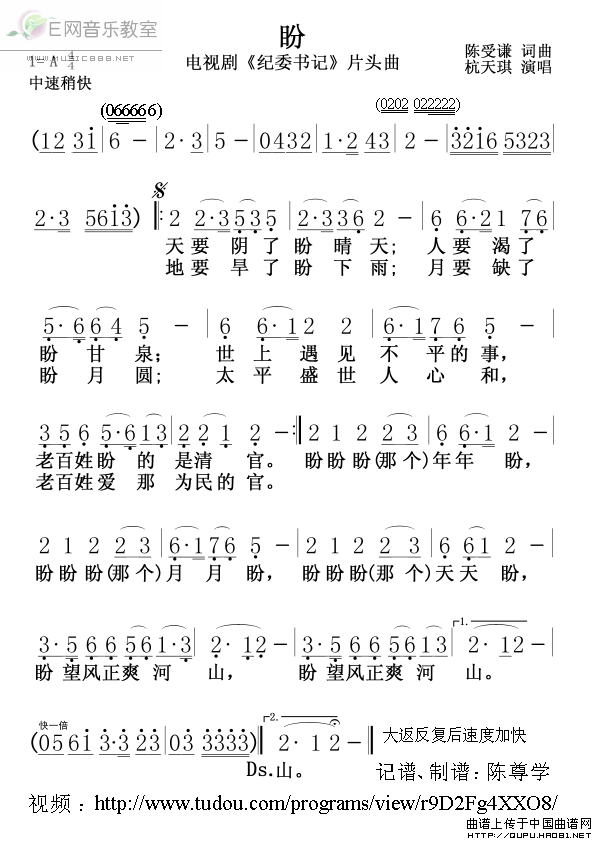 >> 盼-杭天琪(电视剧《纪委书记》片头曲_简谱)