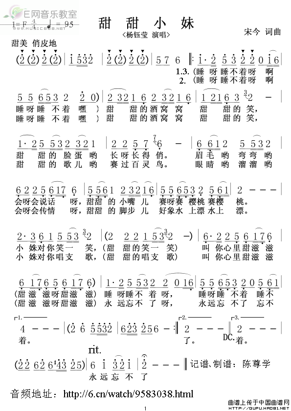 甜甜小妹-杨钰莹(简谱_颂今词曲版)