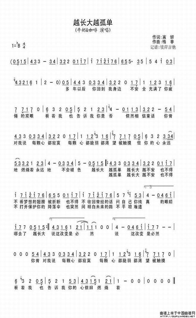 >> 越长大越孤单-牛奶&咖啡(简谱)