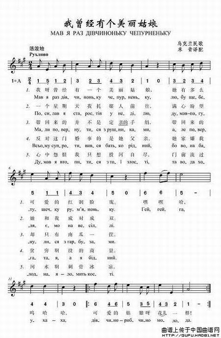 >> 我曾经有个美丽姑娘-乌克兰民歌(简谱+线谱)