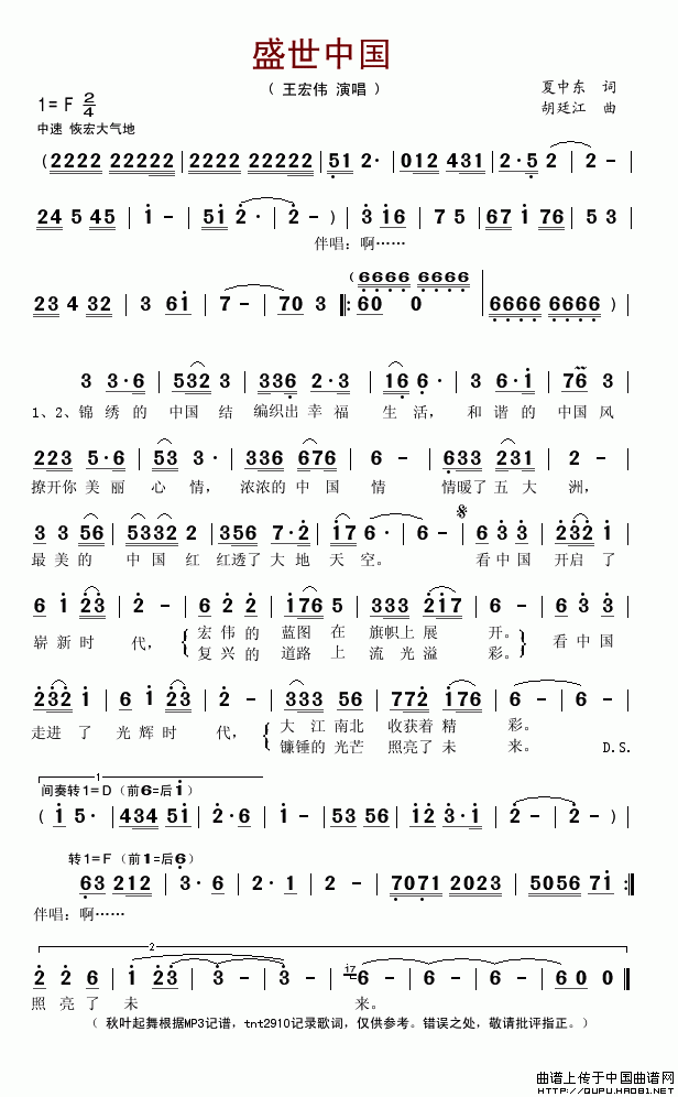>> 盛世中国-王宏伟(简谱)