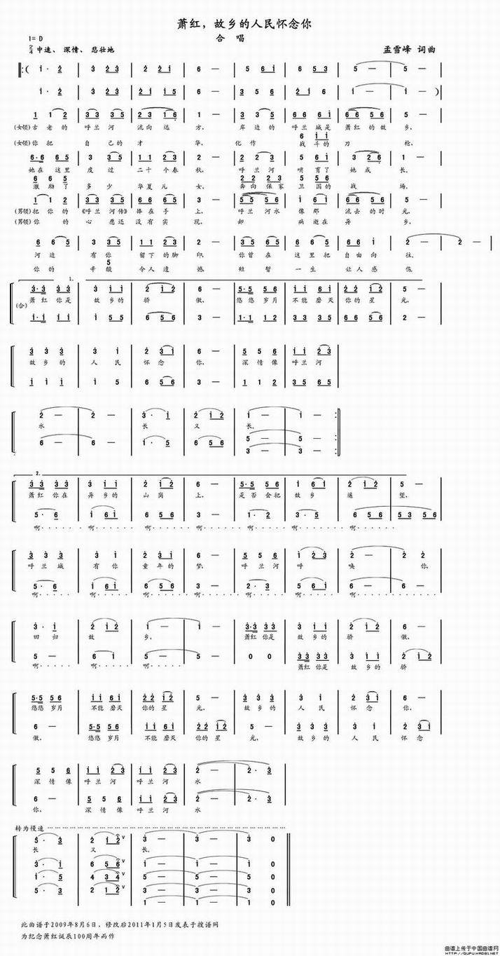 >> 萧红,故乡的人民怀念你-合唱(简谱)