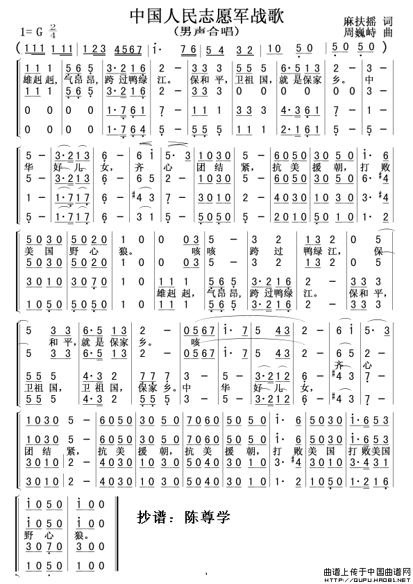 中国人民志愿军战歌-男声合唱(四声部简谱)