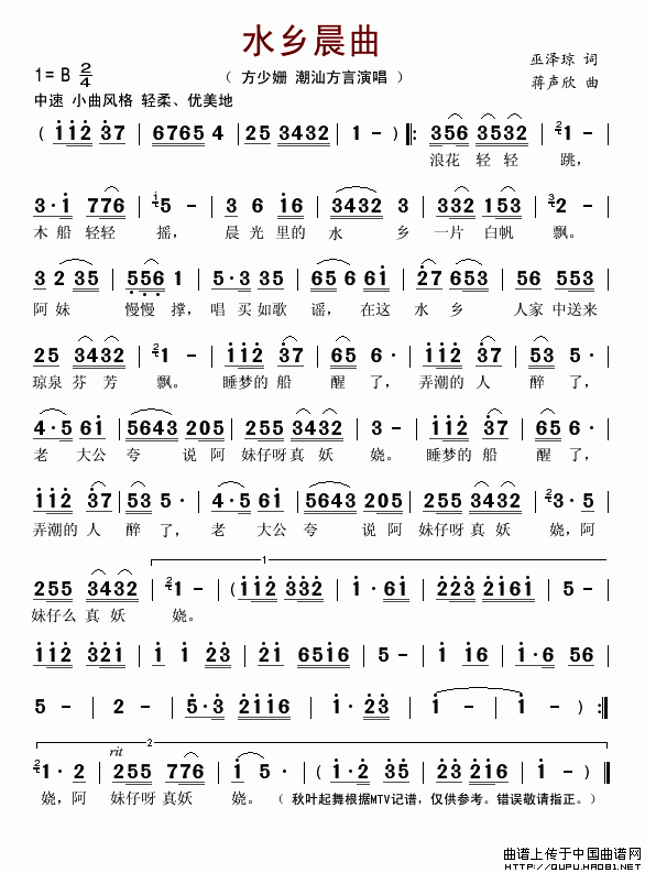 >> 水乡晨曲-方少姗(潮汕方言歌曲_简谱)