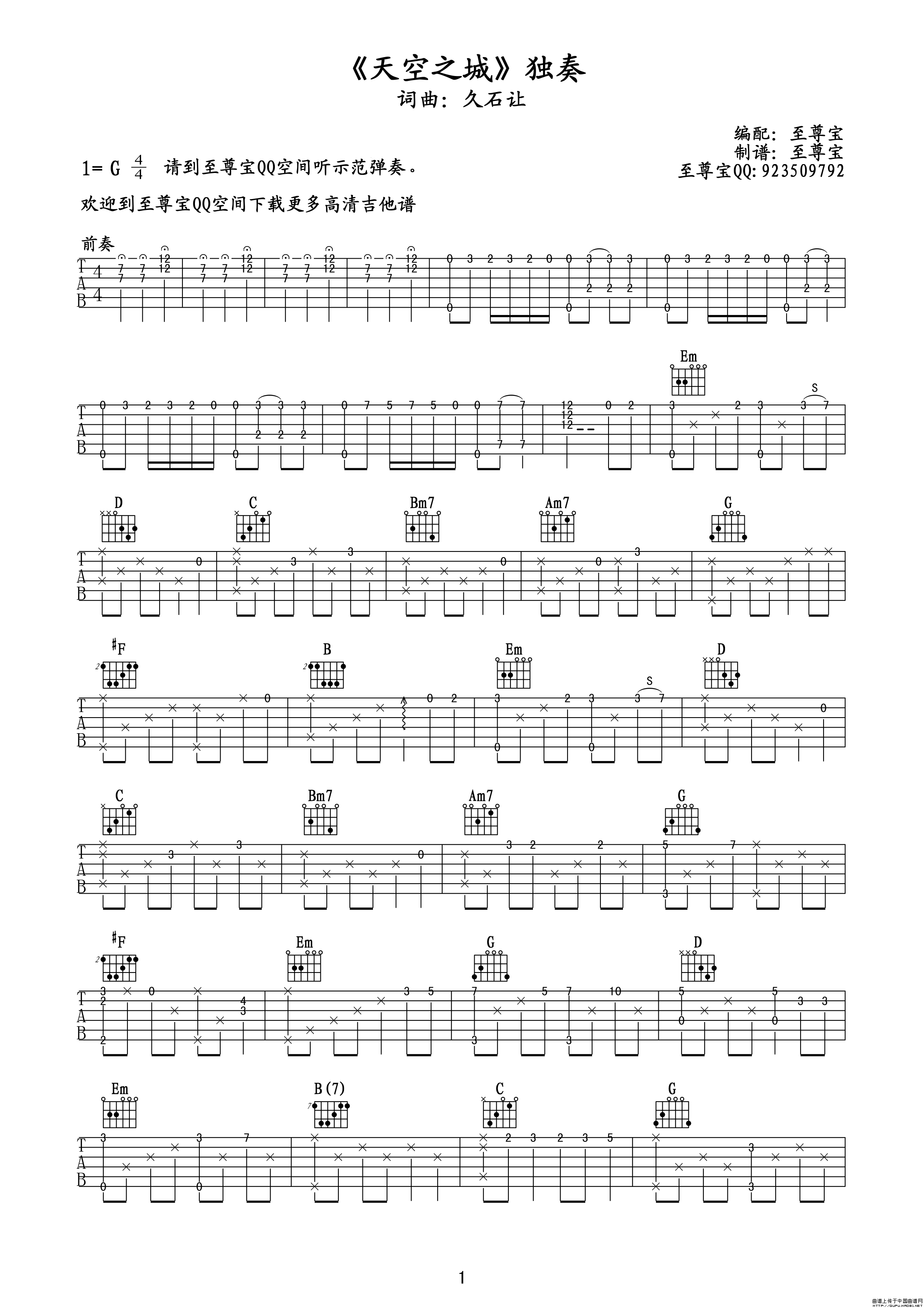 >> 天空之城-指弹独奏(吉他曲谱_简易版)