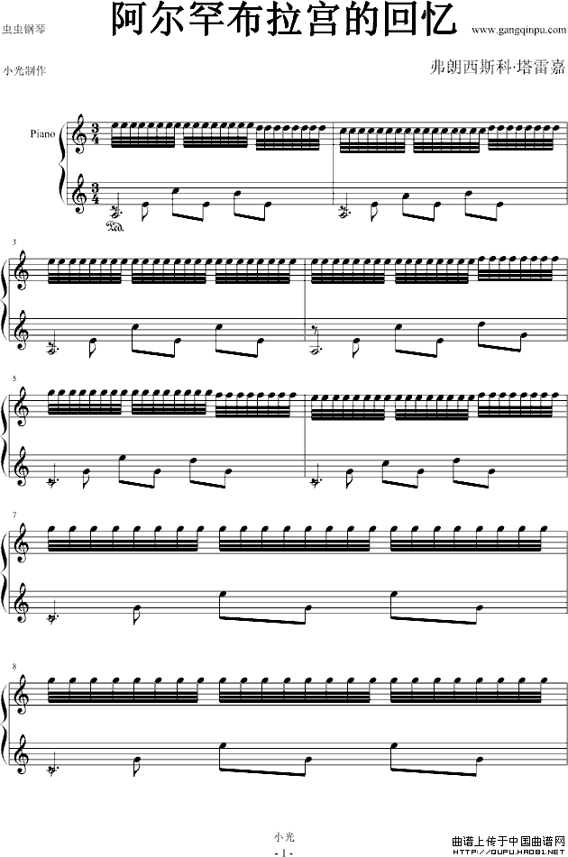 我们可以用钢琴弹奏吉他名曲《爱的罗曼史》,那么,也可以试着用钢琴弹奏这曲《阿尔罕布拉宫的回忆》,当然,这可能会更难一些。