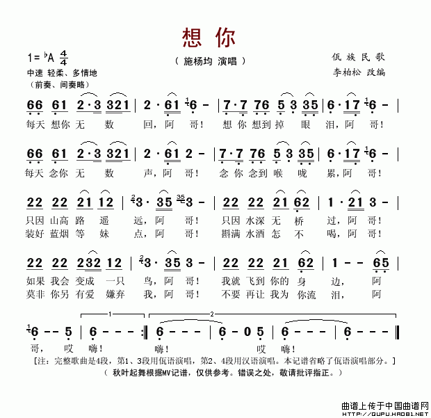 >> 想你-施杨均(佤族民歌简谱)