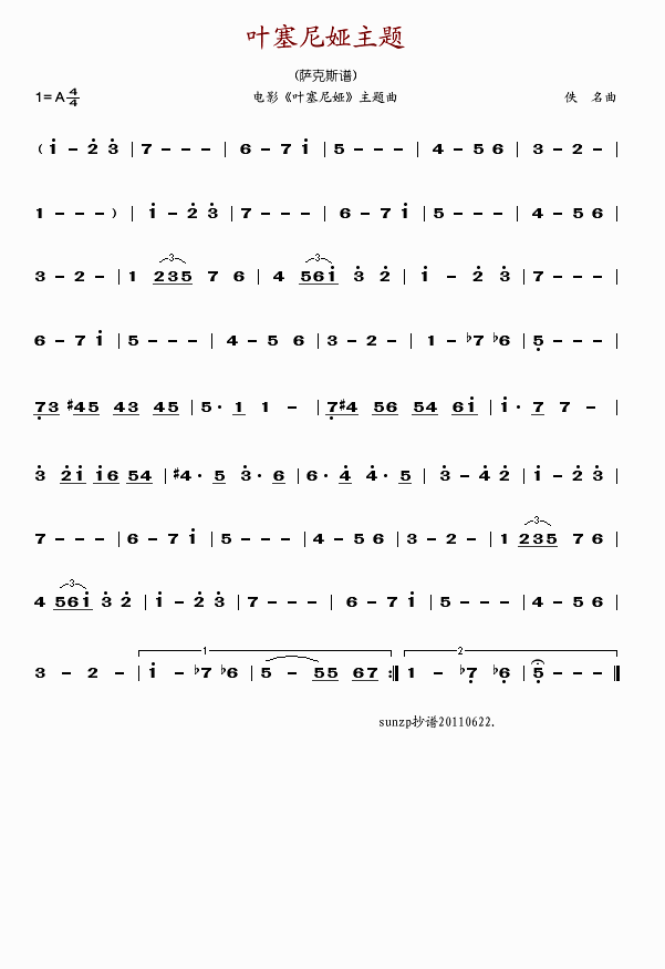 >> 叶塞尼亚主题曲-萨克斯曲谱(简谱)
