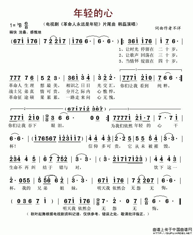 >> 年轻的心-韩磊(《革命人永远是年轻》片尾曲简谱)