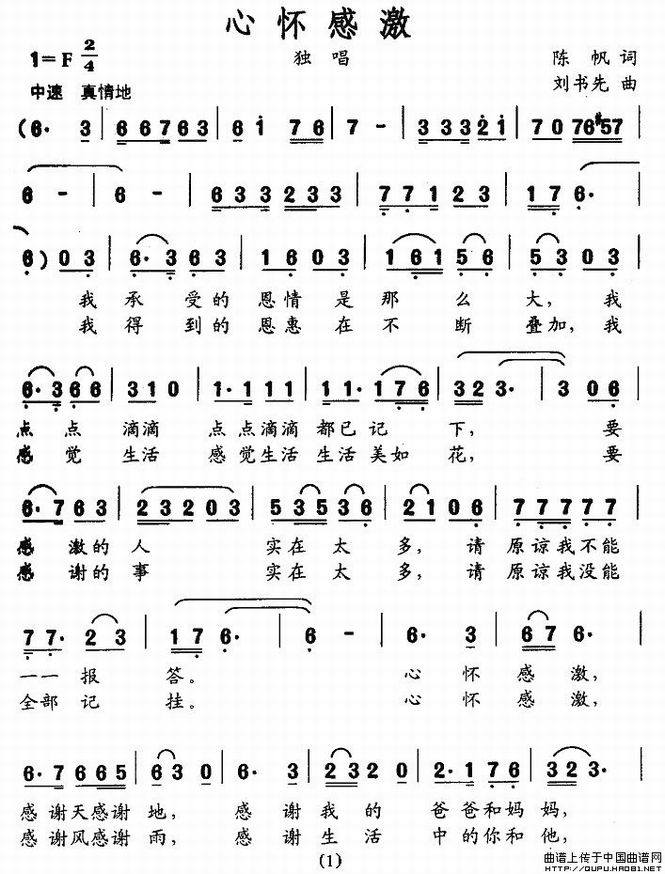 >> 心怀感激-简谱(陈帆词 刘书先曲)
