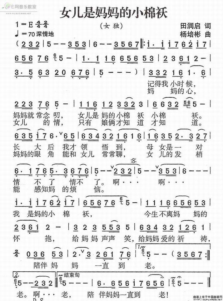 >> 女儿是妈妈的小棉袄-原创歌曲(简谱)