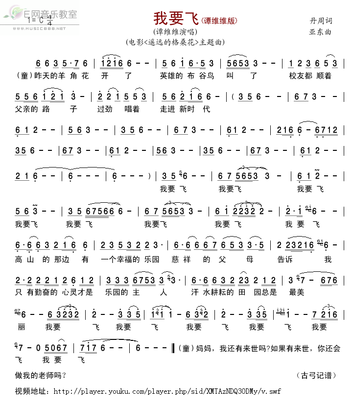 >> 我要飞-谭维维(电影《遥远的格桑花》主题曲简谱)