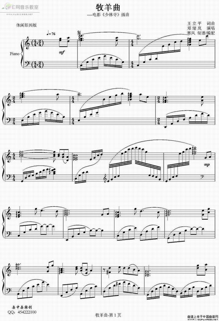 牧羊曲-郑绪岚(电影《少林寺》插曲钢琴谱)
