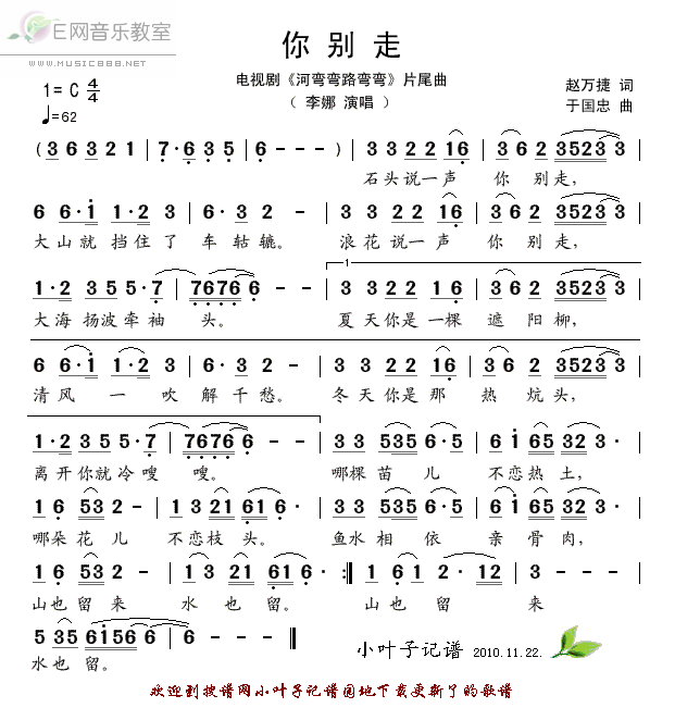 >> 你别走-李娜(《河弯弯路弯弯》片尾曲简谱)