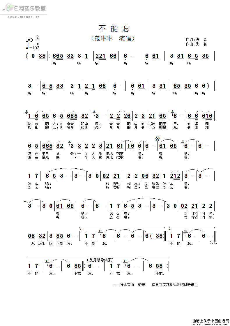>> 不能忘-范琳琳(简谱)