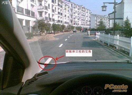 3、从挡风玻璃下沿看到前车后轮胎下沿(或看到地面)时约三米;