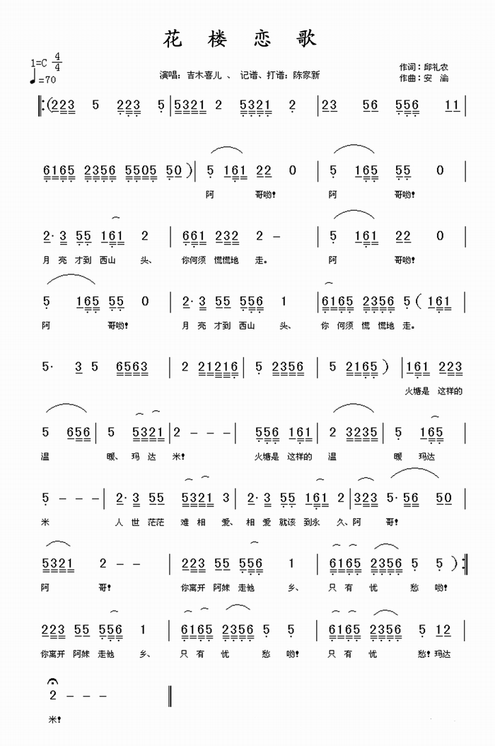 蝴蝶泉边 歌谱 曲谱 乐谱