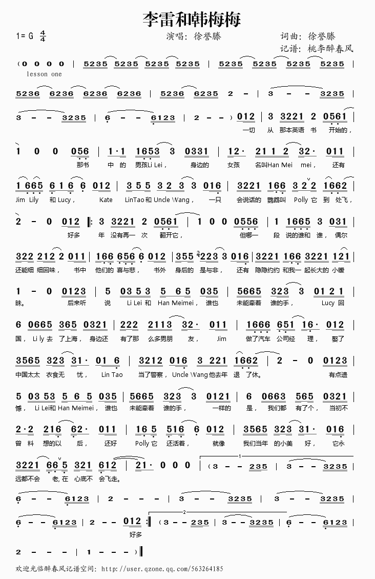 李雷和韩梅梅 简谱 曲谱