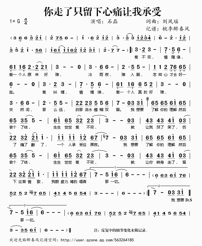 你走了只留下心痛让我承受 简谱 曲谱 歌谱