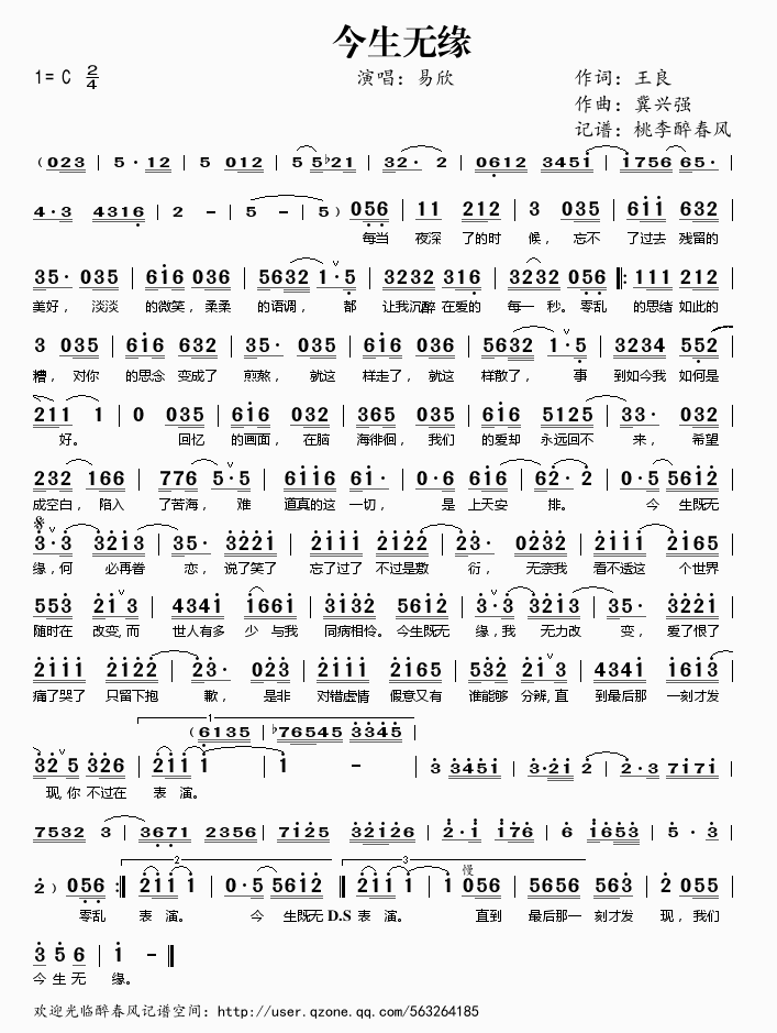 今生无缘 简谱 曲谱 歌谱