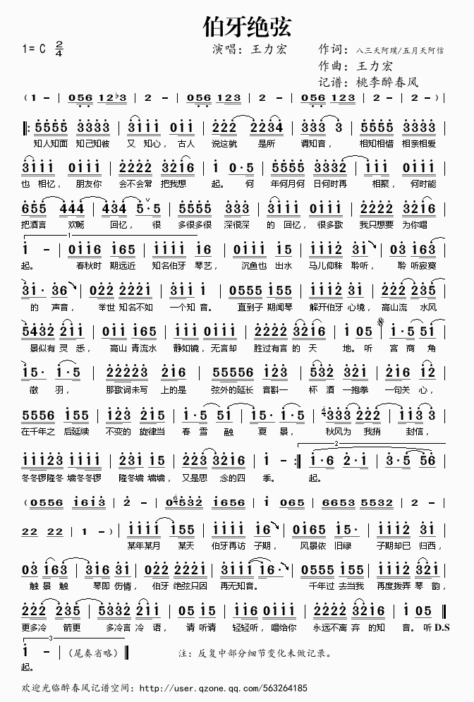 伯牙绝弦 简谱 曲谱 歌谱