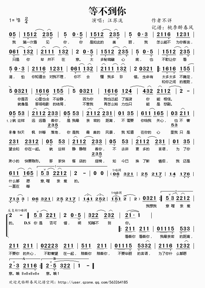 等不到你 简谱 曲谱 歌谱