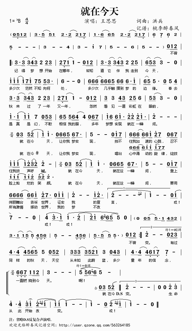 就在今天 简谱 曲谱 歌谱