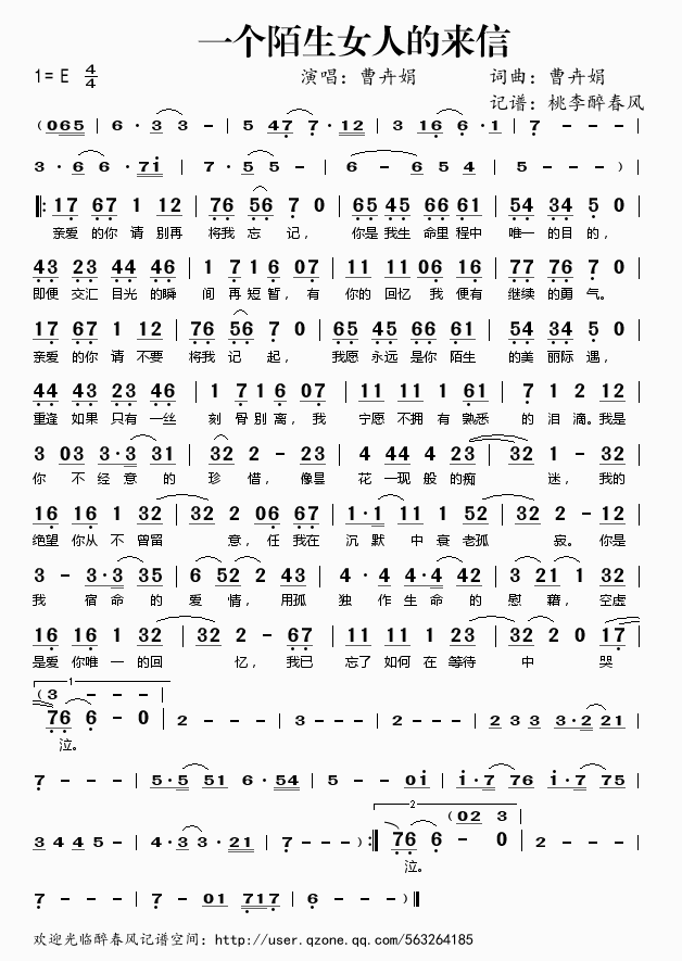 一个陌生女人的来信 简谱 曲谱 歌谱