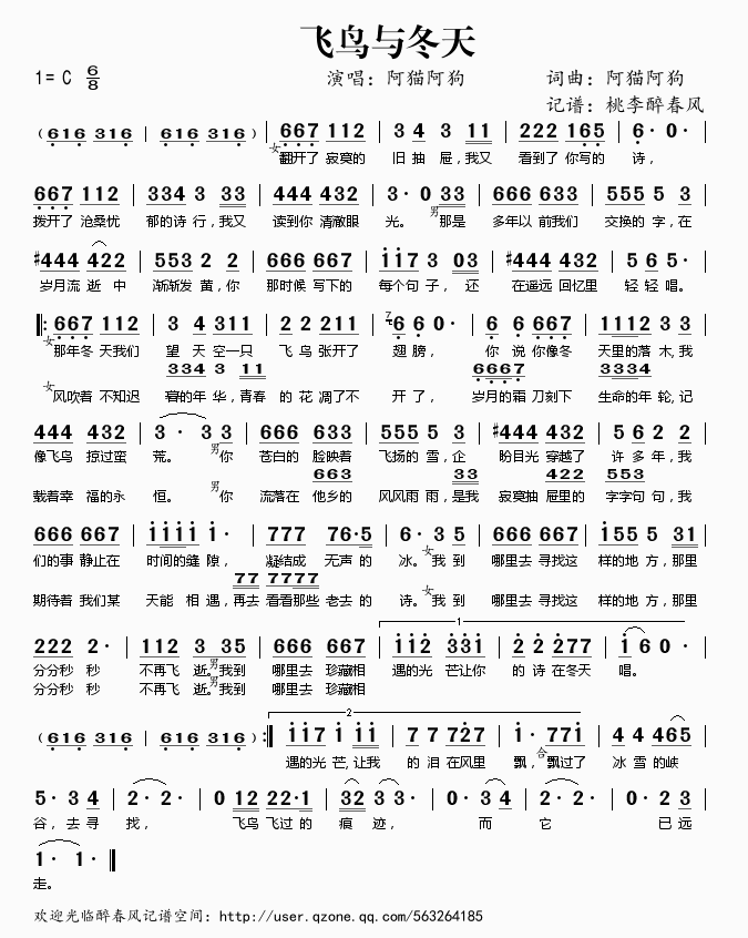 飞鸟与冬天 简谱 曲谱 歌谱