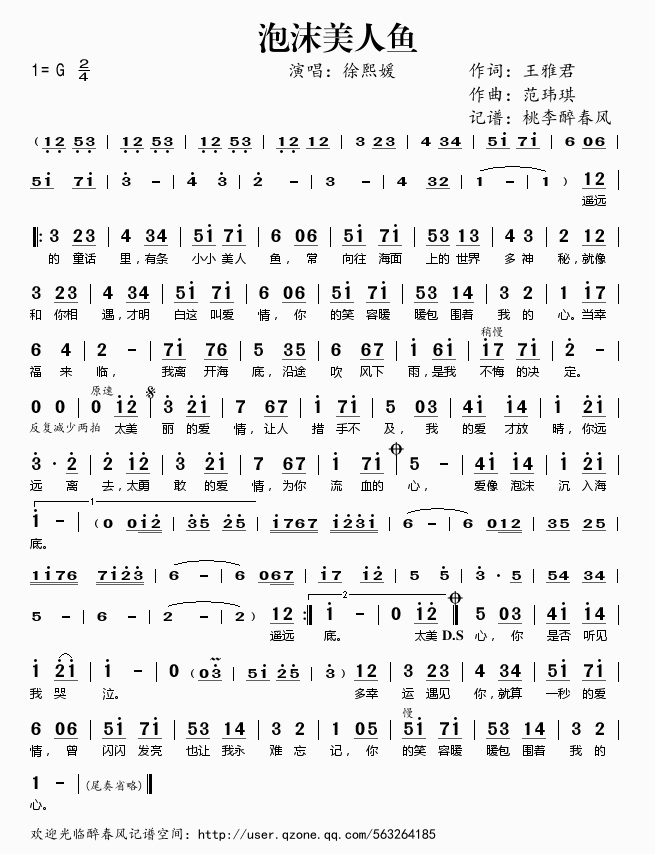泡沫美人鱼 简谱 曲谱 歌谱
