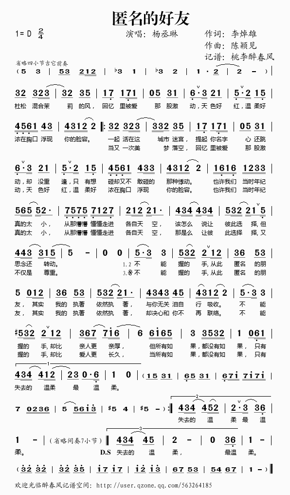 匿名的好友 简谱 歌词