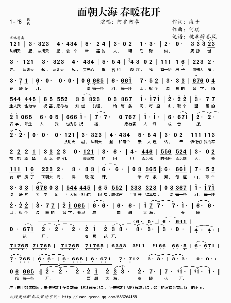 面朝大海 春暖花开 简谱 曲谱 歌谱