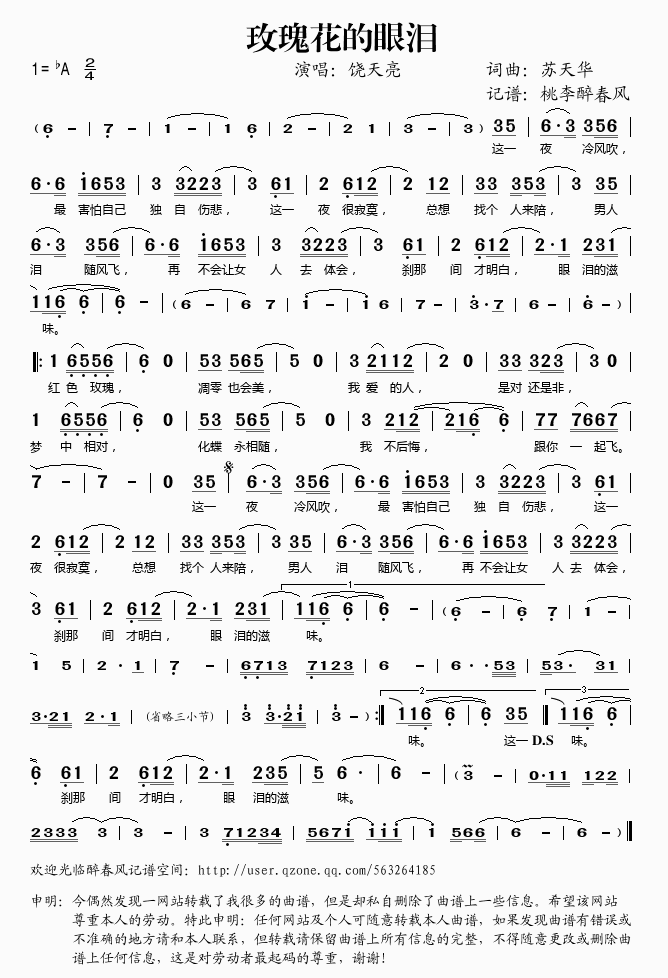 玫瑰花的眼泪 简谱 曲谱 歌谱