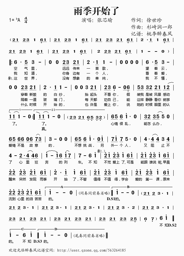 雨季开始了 简谱 曲谱 歌谱