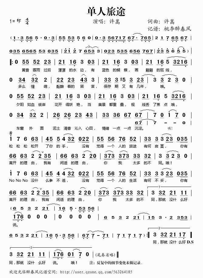 单人旅途 简谱 曲谱 歌谱